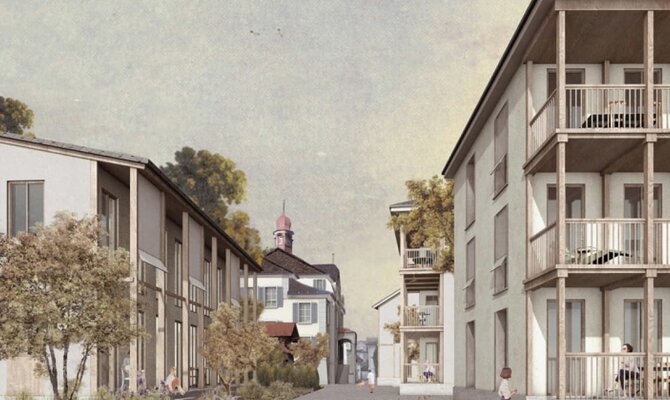 Die Quartierplanung sieht vor, den Parkplatz im Dorfzentrum neu zu gestalten. Während in einem Baufeld vorwiegend Fläche für Gewerbe entstehen, sind in den übrigen Bereichen moderne Wohnbauten vorgesehen. Ein bestehende Wohnhaus im Perimeter bleibt erhalten und wird saniert. Der Gesamtperimeter umfasst 2'655 m² – verteilt auf zwei Parzellen.