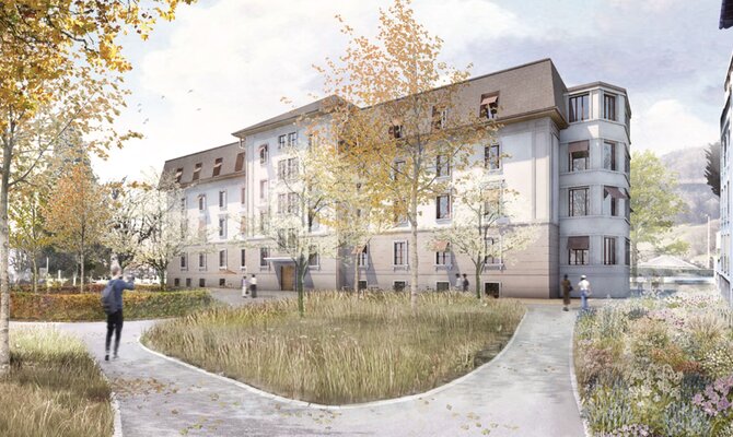 Das denkmalgeschützte Gebäude erhielt durch gezielte architektonische Eingriffe seine ursprüngliche Ausstrahlung zurück. Besonders ist die Umgestaltung der Dachlandschaft: Das im Jahr 1972 aufgestockte dritte Obergeschoss wurde als Mansardengeschoss verkleidet – ein Eingriff, der dem Haus wieder seine ursprünglichen Proportionen verleiht. Die neue Dachform orientiert sich am benachbarten Konvikt, das bereits 1910 ein Mansarddach erhalten hat. Auch die Fassadengestaltung wurde mit grosser Sorgfalt angegangen. Gliederungselemente und Farbkonzept lehnen sich eng an das historische Original an. Nur bei den Fenstern im Patientenbereich werden aus funktionalen und sicherheitstechnischen Gründen dezente Anpassungen vorgenommen.