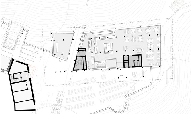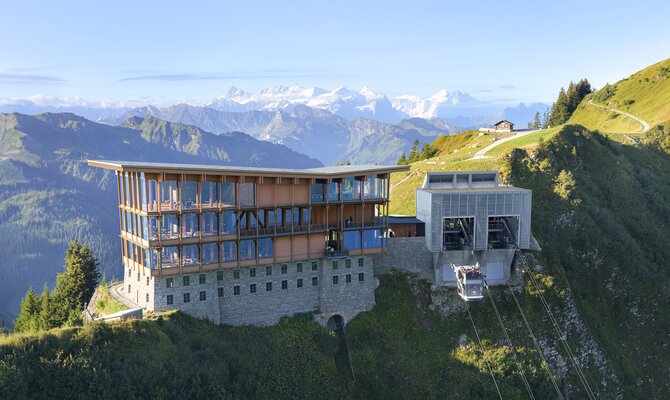 Die Gestaltung nimmt bewusst Bezug auf die Geschichte des Stanserhorns: Die Formensprache erinnert an das historische Hotel aus den Anfangszeiten des Tourismus – jedoch konsequent für Tages- und Eventgäste weitergedacht. Die prägnante Dachlinie folgt dem Verlauf der ehemaligen Standseilbahn und setzt ein starkes, identitätsstiftendes Zeichen. Ein offener Durchgang im Erdgeschoss schafft ein fliessendes Erlebnis und wird mit einer neuen Plattform in Richtung Norden abgerundet.