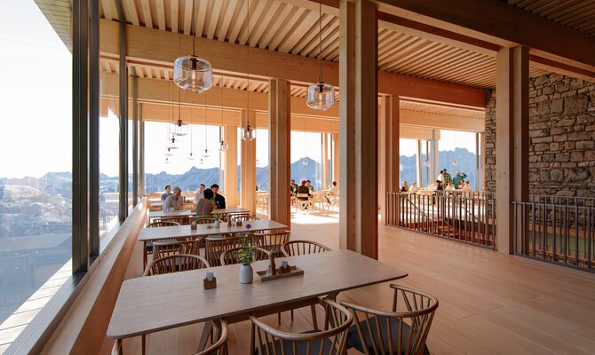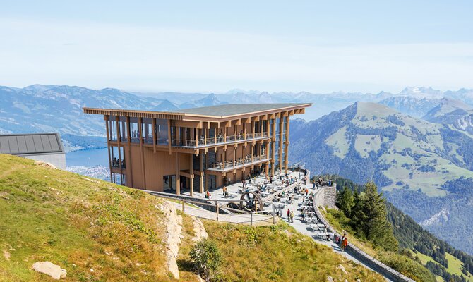 Im Zentrum des Siegerprojekts von der Arbeitsgemeinschaft Weitschies Krähenbühl aus Chur stehen grosszügige, lichtdurchflutete Räume, vielseitige Gastronomieangebote und eine deutliche Steigerung des Gästekomforts. Grossflächige Glasfronten eröffnen spektakuläre Panoramen über Mittelland, Vierwaldstättersee und Alpen. Die Terrasse erhält ihre ursprüngliche Form zurück und wird durch zusätzliche Aussenbereiche auf allen Etagen erweitert – ein klares Plus für Besucherinnen und Besucher.
