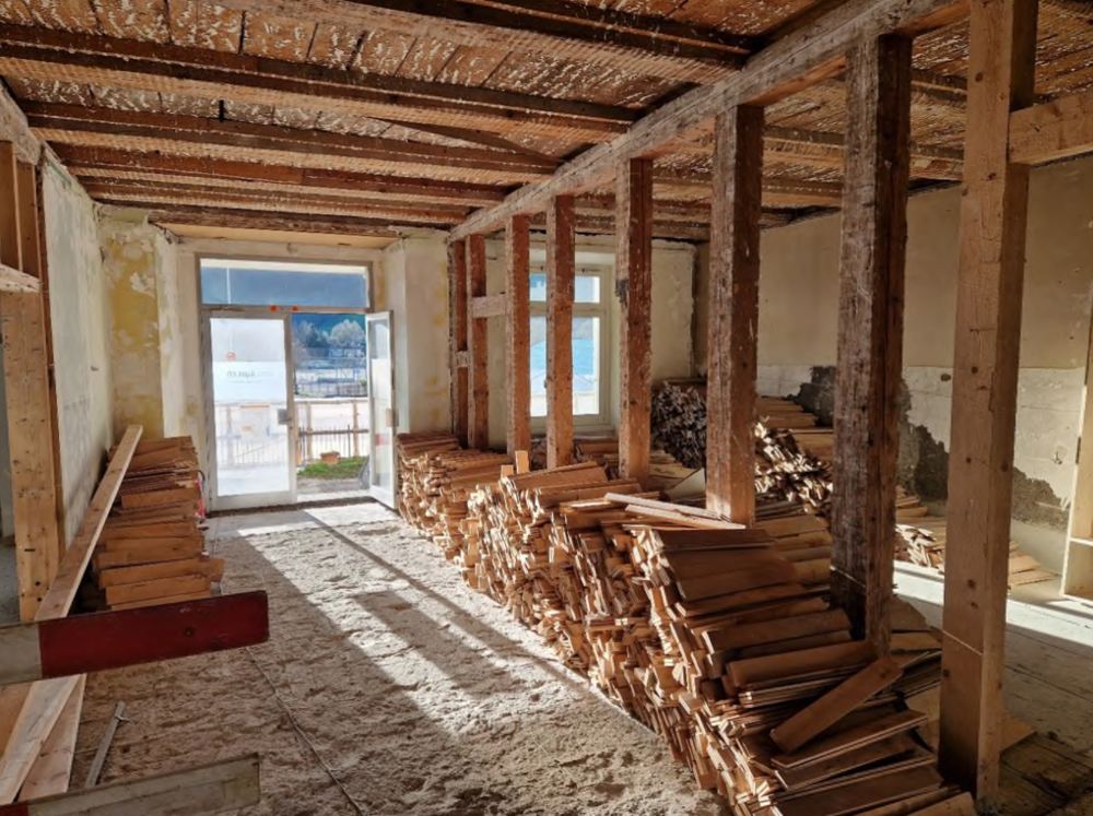 Im Inneren blieb die bauzeitliche Struktur mit der zentralen zweiläufigen Treppe und den versetzten Korridoren erhalten. Die historischen Binnenwände wurden weitgehend respektiert und wo nötig sorgfältig instandgesetzt. So bleibt die einzigartige Atmosphäre des Hauses erhalten, während moderne Anforderungen an Nutzung und Sicherheit integriert werden.