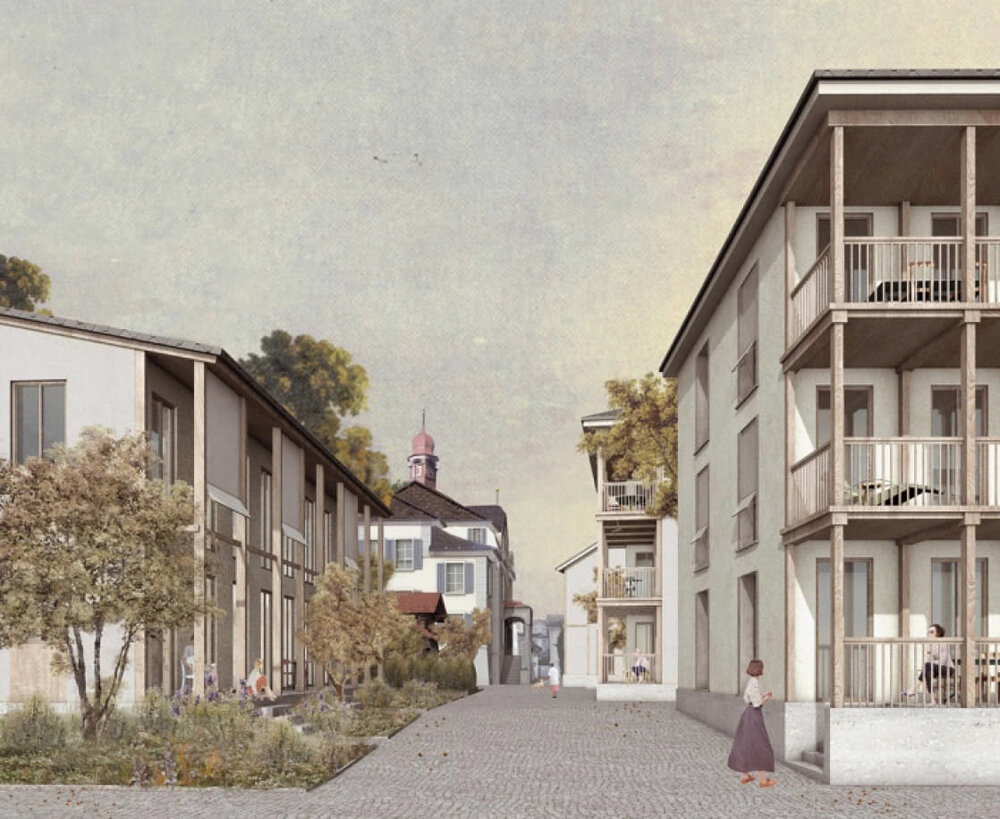 Die Quartierplanung sieht vor, den Parkplatz im Dorfzentrum neu zu gestalten. Während in einem Baufeld vorwiegend Fläche für Gewerbe entstehen, sind in den übrigen Bereichen moderne Wohnbauten vorgesehen. Ein bestehende Wohnhaus im Perimeter bleibt erhalten und wird saniert. Der Gesamtperimeter umfasst 2'655 m² – verteilt auf zwei Parzellen.